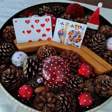 Für noch mehr Entlastung sorgt der Tisch-Spielkartenhalter aus Holz, mit dem sich alle Karten übersichtlich aufreihen lassen und der dadurch das einhändige Mitspielen ermöglicht. So können Sie sich ganz auf den Jass – und das Gewinnen – konzentrieren.